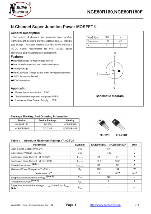 The 60R180F is a power MOSFET typically used in high-voltage and high-power applications. It is encapsulated in a TO-220F package, which provides good thermal performance and electrical insulation due to its plastic housing.