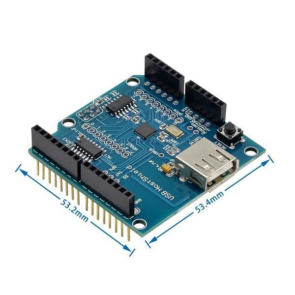 The Arduino Compatible USB Host Shield is based on the MAX3421E, which is a USB peripheral/host controller containing the digital logic and analog circuitry necessary to implement a full-speed USB peripheral or a full-/low-speed host compliant to USB specification rev 2.0. it is compatible with more Arduinos – not only UNO and Duemilanove but also Mega and Mega 2560 work with a Standard variant of this shield out of the box. No more SPI re-wiring and code modifications – just solder included stackable connectors (2×3 ICSP connector’s female side should be facing down), plug and play! Using Arduino Compatible USB HOST function, let your Arduino communicate with other USB devices, and supports USB HUB function.