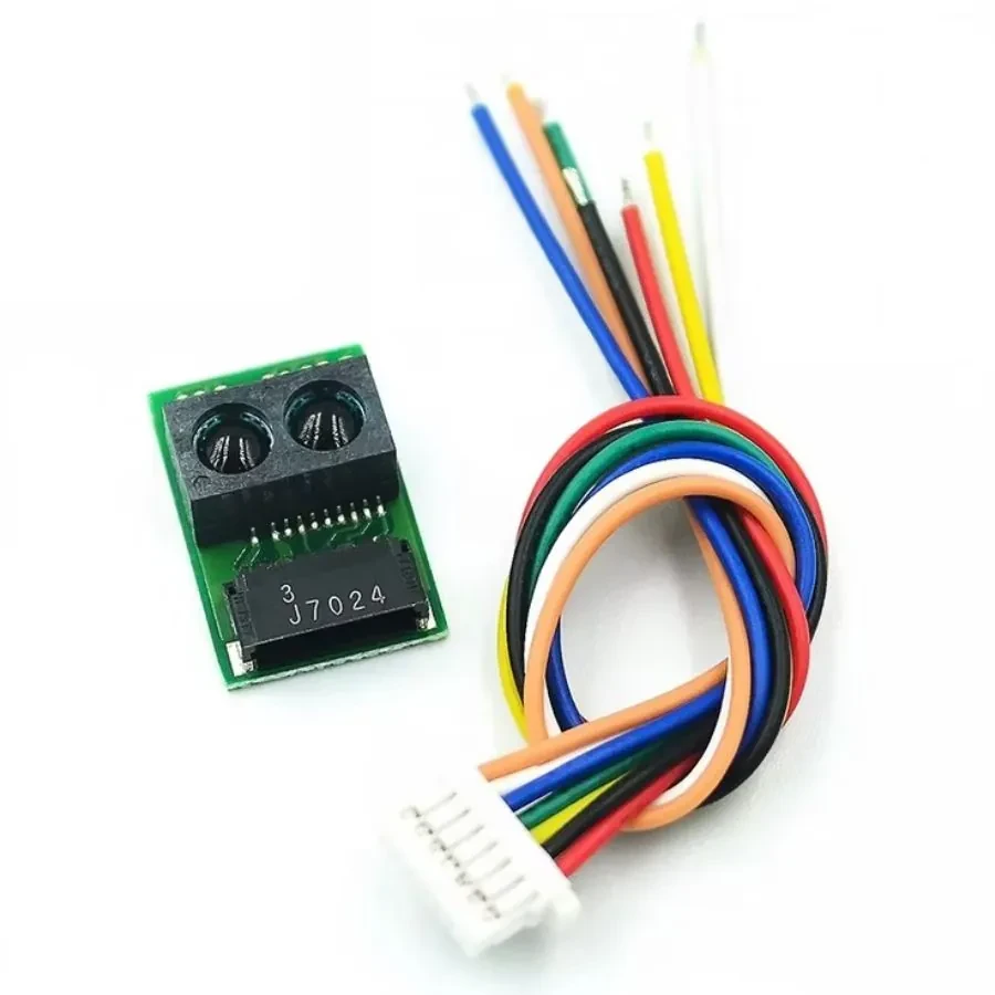 The GP2Y0E03 is a compact, high-precision infrared distance sensor module developed by Sharp, designed for measuring distances ranging from 4 to 50 cm. It uses an infrared LED and a CMOS image sensor, employing the triangulation method to provide accurate distance measurements that are minimally affected by the object's reflectivity, ambient temperature, or operating duration. The module supports both I2C (digital) and analog output, making it versatile for various applications, including Arduino and other microcontroller projects.